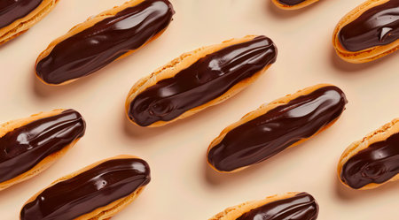 Chocolate eclairs on cream background, top view, minimal flat lay style.