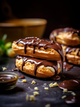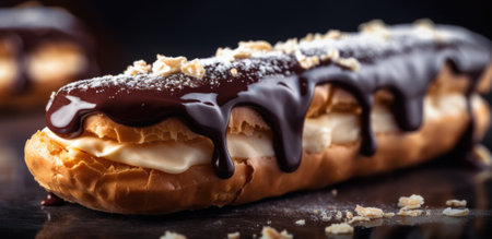 Generative AI, Chocolate eclairs side view, sweet food. Traditional French dessert