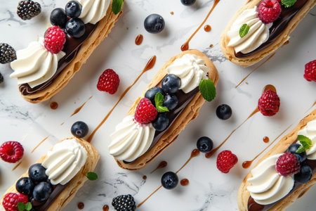 Delicious eclairs with fresh berriesle table, top view