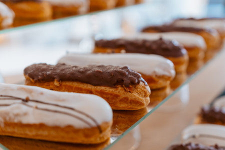 Eclairs on the shelf of a pastry shop or cafe. Tasty french sweets on window shop, delicious pastries for coffee. Cakes in pastry shop, variety of desserts with creamy topping on display in bakery.