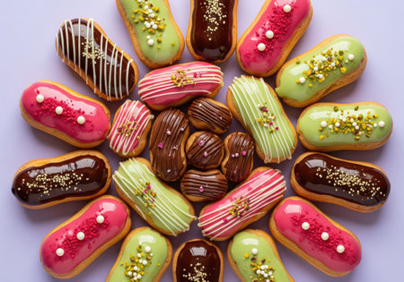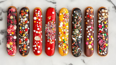 Vibrant array of eclairs with various toppings and flavors, perfect for dessert.