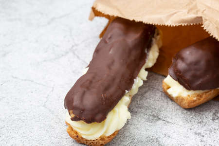 Chocolate eclair with a custard cream filling in a brown paper bag. Environmentally friendly packaging for recycling