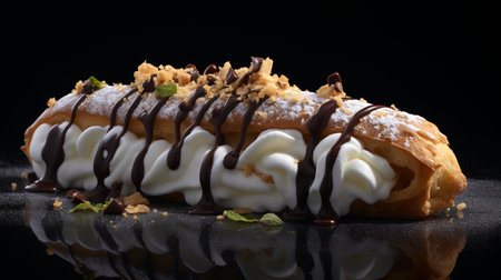 ice cream in a piece of dough, topped with creme and chocolate sauce, is captured in this neogeo-style food photo. shot with provia, the 32k uhd image showcases elongated shapes against a black background. the absurdist installations and multi-layered composition add depth to this visually stunning photograph. ai generated