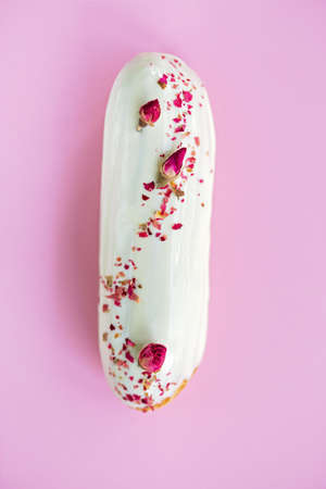 French dessert eclairs or profiteroles with rose-flavored white chocolate glaze, on a pink background. Pastry cakes with custard, rose cream and topping. Soft selective focus.