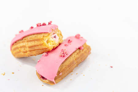 Set of delicious eclairs with pink raspberry glaze and sugar sprinkles on white background.