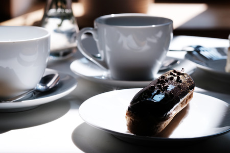 Elegant eclair filled with cream and topped with glossy chocolate glaze served alongside a cup of black coffee on a minimalist white plate