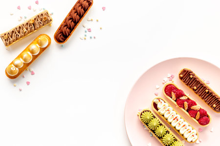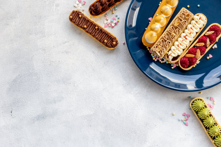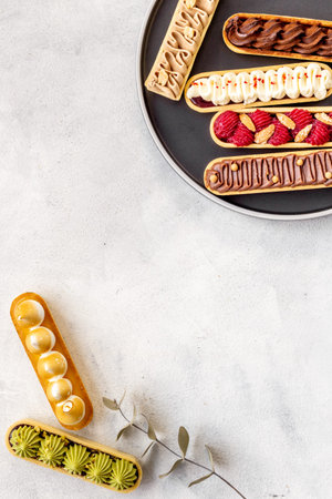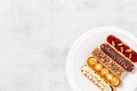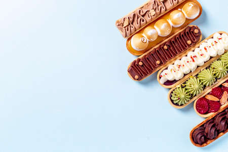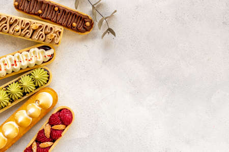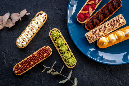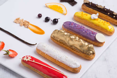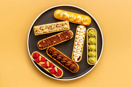 Set of french dessert eclairs with colorful topping