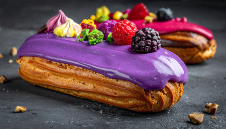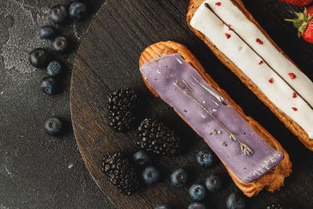 Sweet and colorful eclairs with berry Group of french dessert Eclair on violet background. custard pastry dessert with whipped cream inside