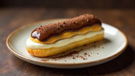 A luscious chocolate eclair adorned with creamy filling sits on a rustic wooden table. Rich layers of chocolate glaze and cocoa powder enhance the visual appeal. Sweetness fills the air.