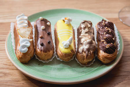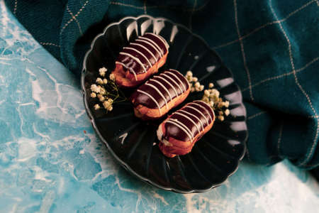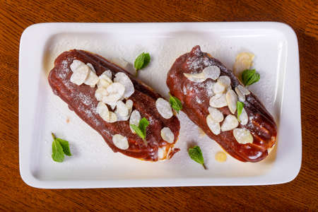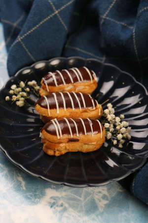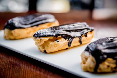 Eclairs with the filling on the plate is a traditional French dessert