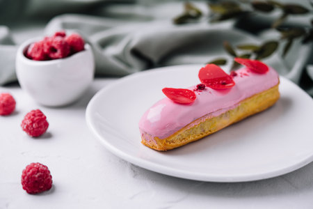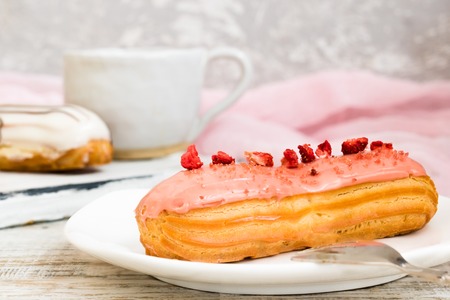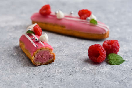 delicious eclairs with pink raspberry glaze