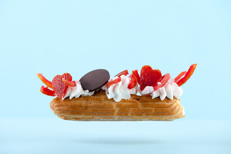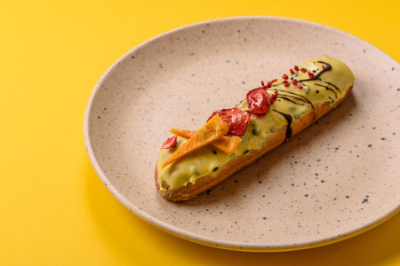 exquisite cream dessert eclair with candied fruit