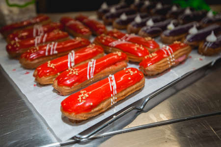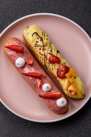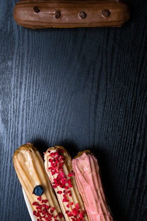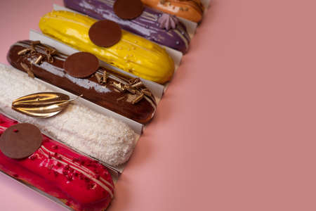 French food, dessert eclair with chocolate filling and covered with colored icing. Sweet eclair as a background for your design