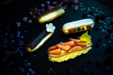 Different eclair dessert on dark wooden table decorated with strawberries and flowers