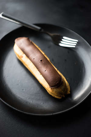 Black plate with eclair on dark wooden table with copyspace