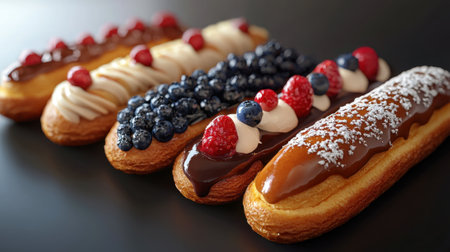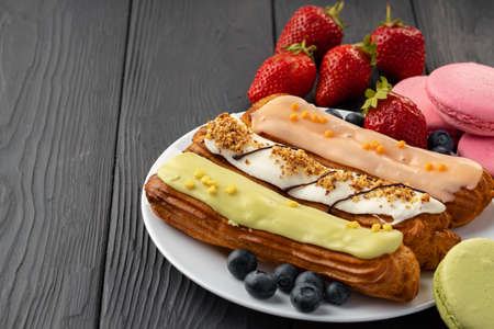 Set of delicious dessert eclairs with colorful topping.