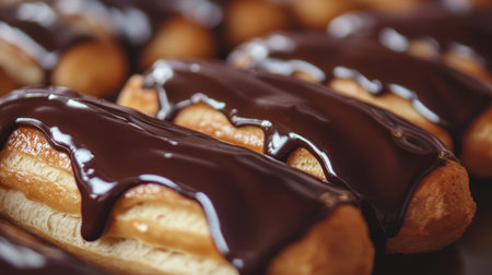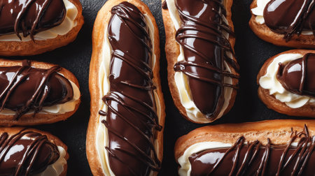 A visually appealing arrangement of chocolate eclairs showcasing rich cream filling and a decadent chocolate drizzle on top, perfect for indulgent moments.