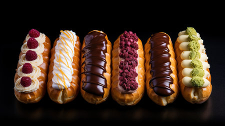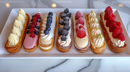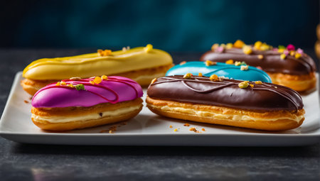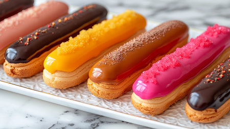Assorted eclair desserts on white plate, vibrant flavors and fillings, deliciously tempting