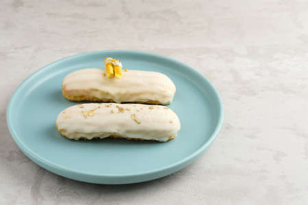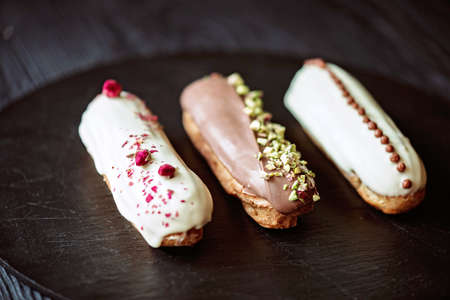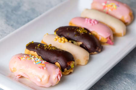 Many icing eclairs cakes on plate. Sweet food background