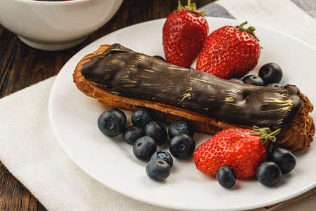 eclairs decorated with fresh berries on a white plate, handmade, culinary theme, close up