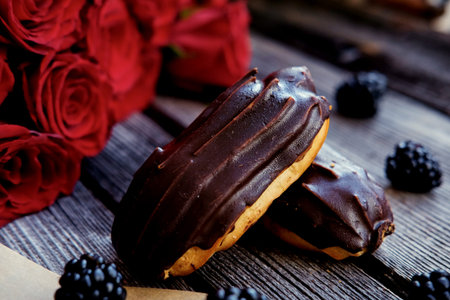 Delicious chocolate-covered eclairs are arranged beautifully on a wooden surface, showcasing their fluffy pastry and rich glaze, perfect for chocolate dessert lovers.