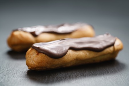 two eclairs with dark chocolate on top on slate background, shallow focus