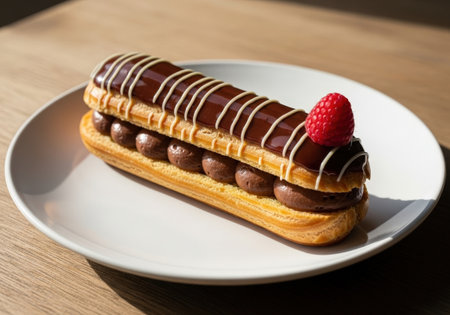A chocolate eclair with cream filling and a fresh raspberry on a white plate. This elegant dessert is illuminated by beautiful sunlight, perfect for a cafe.