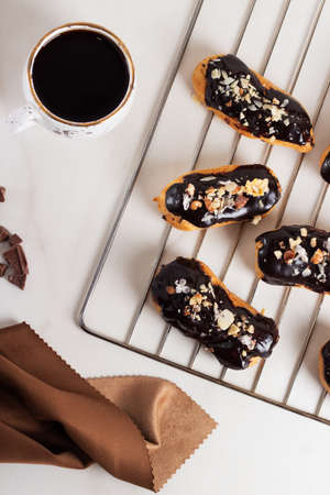 Traditional french dessert - eclairs with chocolate glaze. Pieces of chocolate and coffe on marble background. Dessert Pastry filled with cream.