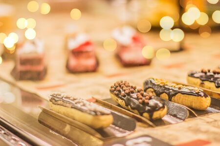 Delicious eclairs on the counter of a bakery shop.