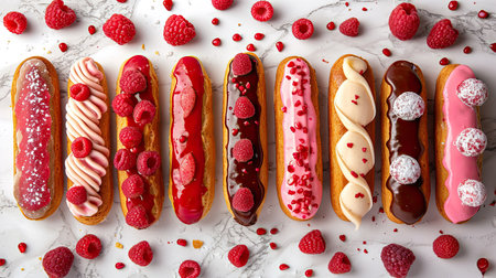 Group of decorated eclairs with pistachio raspberries and chocolate