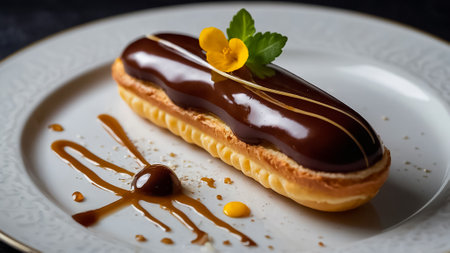 Decadent Delight: Tempting Eclair, French Pastry Masterpiece. Delicate choux pastry shell filled with a luscious cream filling and adorned with a glossy layer of rich chocolate ganache. AI generated