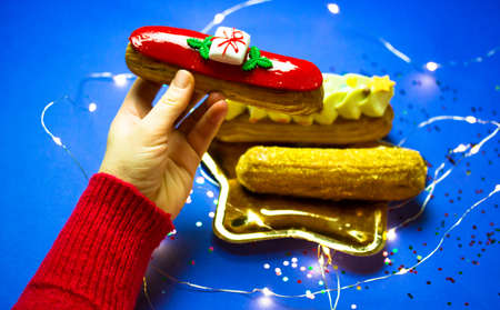 Yummy beautiful red eclair decorated in New Year's theme in woman's hand against top view. Christmas 2022 delicious dessert, blue background. Plate with eclairs among garland lights. Sweet food treats