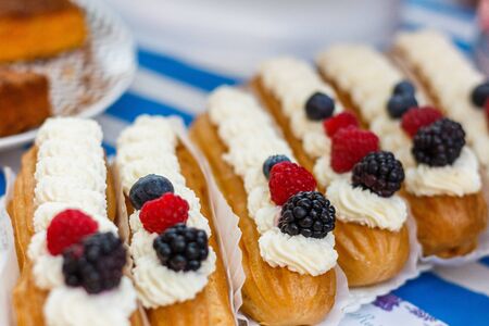 Delicious eclairs with raspberries, blackberries and blueberries