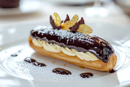 A close-up of a beautifully crafted éclair, filled with vanilla pastry cream and topped with a glossy chocolate glaze. The éclair is garnished with a delicate chocolate decoration and a sprinkle of gold leaf for a luxurious touch.