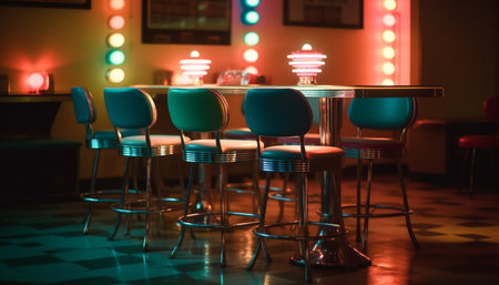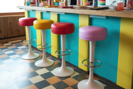 retro soda fountain counter with colorful bar stools, created with generative ai