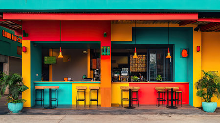 Exterior of a trendy South Asian street food cafe with vibrant colors and signage. No people, copy space available