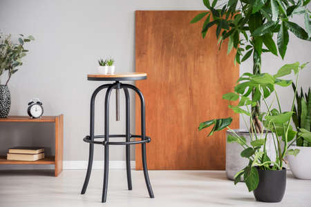 Black table between wooden cabinet and plants in grey living room interior with desk. Real photo