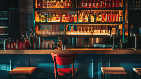 High chair at modern night club bar, bartender's shelf filled with liquors