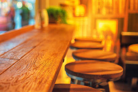 An empty bar counter with a wooden board, a retro space for creative design.