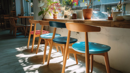 A cozy cafe interior showcasing colorful wooden chairs bathed in natural sunlight. The inviting atmosphere promotes relaxation and social interactions, perfect for enjoying coffee or a good book.