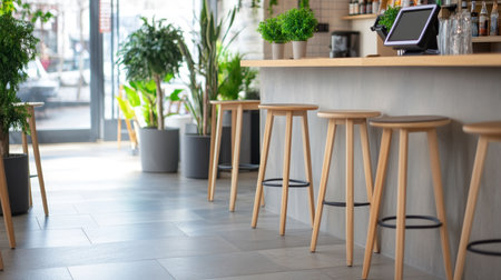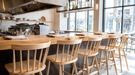 A bright and alluring restaurant interior featuring a warm wooden counter, modern stools, and expansive windows, creating a welcoming dining atmosphere.