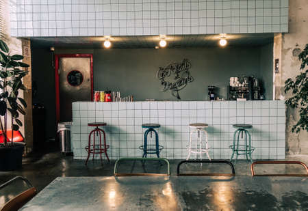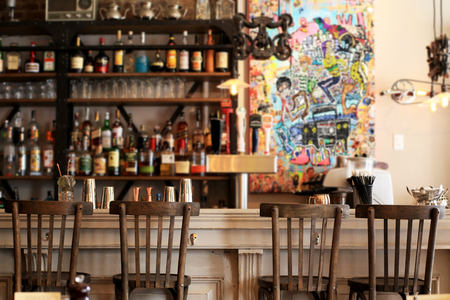 Interior of a pub with bar chairs and tables, vintage style
