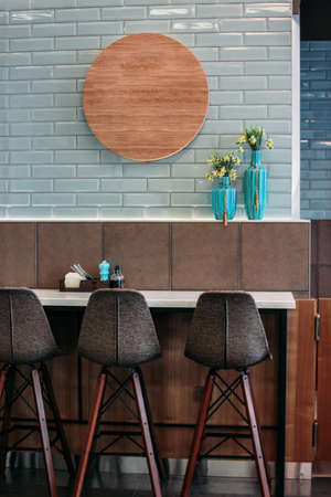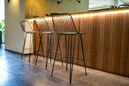 Selective focus on the high chairs in front of the counter bar at the coffee shop and cafe with the light of sunset from outside.