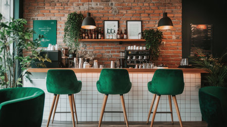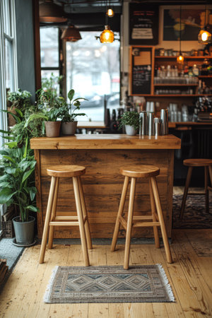 Discover a charming cafe interior with a wooden bar counter, stylish decor, warm lighting, and inviting atmosphere ideal for enjoying drinks and relaxing with friends.
