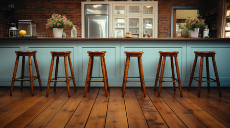 A soft focus of a row of wooden stools at a bar