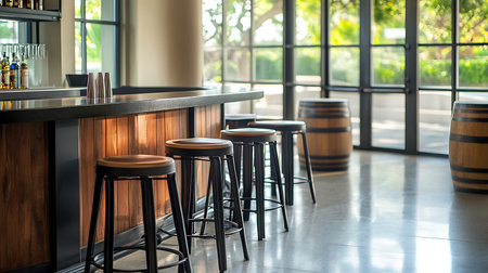 A serene view of a modern bar interior inviting patrons to unwind in a cozy urban setting.