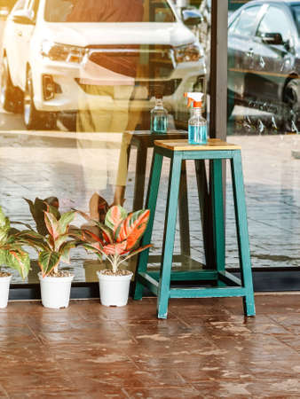 Blue alcohol gel bottle for hand cleaning to prevent the spreading of the Coronavirus (Covid-19), Placed on table to service for customers in the cafe. Healthcare concept. New normal lifestyle