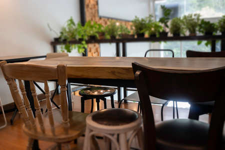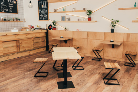 stylish interior of modern cafe with stylish wooden furniture