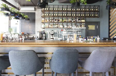 Online bar. Bar counter with soft chairs in cafe with no visitors, blurred background, panorama, copy space