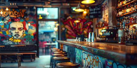 Colorful urban bar with graffiti decor creating a vibrant and edgy atmosphere. Concept Urban Bar, Graffiti Decor, Vibrant Atmosphere, Colorful Drinks, Edgy Style,
